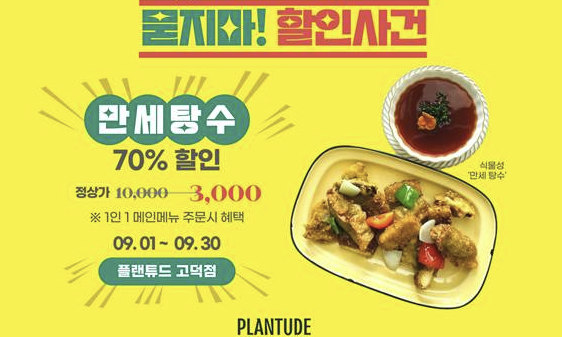 플랜튜드 고덕점에서는 1인 1메뉴 주문 고객에게 '만세 탕수'를 70% 할인된 가격으로 제공한다.