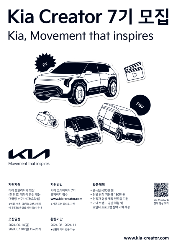 최종 선발된 합격자들은 'PBV' 또는 'EV' 중 하나의 키워드를 선정해 'Z세대가 그리는 기아의 미래 움직임'을 주제로 5분 이내 영상을 제작한다.