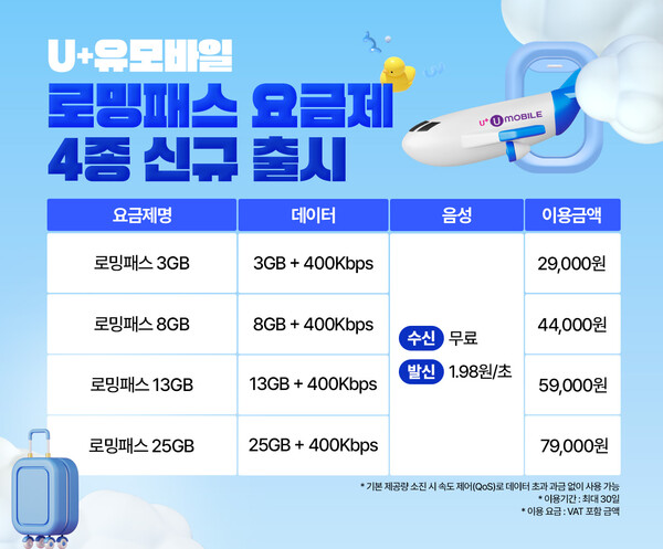 새롭게 출시한 로밍 상품은 4종으로 △로밍패스 3GB △로밍패스 8GB △로밍패스 13GB △로밍패스 25GB이다.