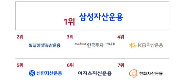 자산운용사 부문은 삼성자산운용이 1위에 올랐으며 △미래에셋자산운용 △한국투자신탁운용 △KB자산운용 △신한자산운용 등이 뒤를 이었다.