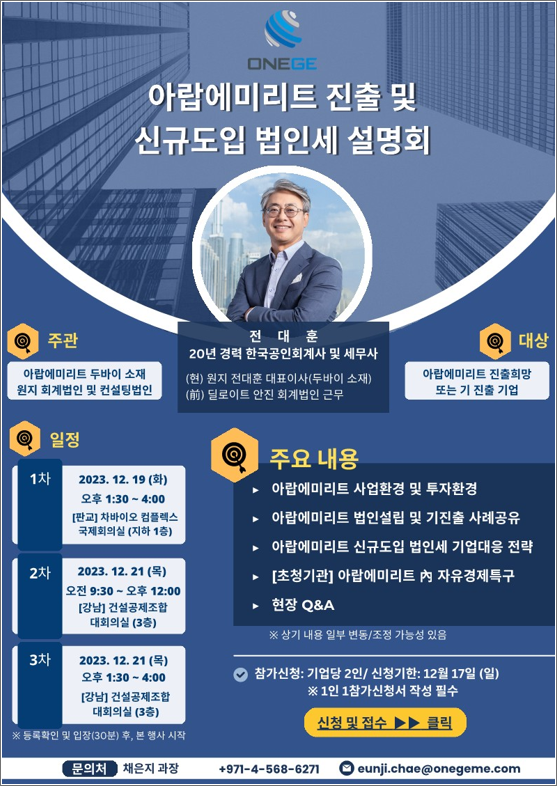 아랍에미리트 두바이 소재 현지기업 원지(ONE GE) 회계·컨설팅(대표이사 전대훈·한국공인회계사 및 세무사)은 오는 19일 방한해 UAE 진출 관심 국내기업 대상으로 '아랍에미리트 진출 및 신규도입 법인세 설명회'를 무료로 개최한다.