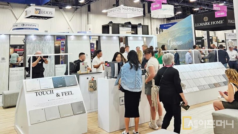 현대L&C는 북미 지역에서 수요가 높은 하이엔드 엔지니어드 스톤 오피모 콜렉션도 선보였다.