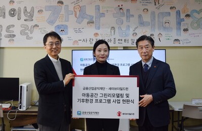 금융산업공익재단과 국제아동권리단체 세이브더칠드런이 8일 충남 논산 사랑지역아동센터에서 아동공간 그린리모델링 및 기후환경 프로그램 사업 현판식을 진행했다.