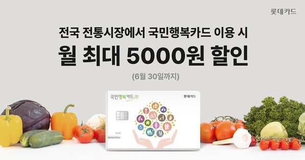 소비자는 행사 기간에 롯데 국민행복카드로 전통시장 디지털온누리상품권 가맹점(12만여곳)에서 1만원 이상 결제 때 월 최대 5회 1000원 할인(1일 1회)된다.