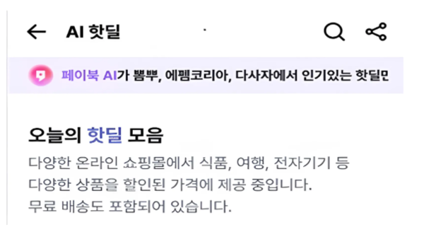 특히 페이북으로 공유된 게시글 가운데 해당 커뮤니티에서 조회수 상위 20%에 속하는 정보는 'HOT' 마크를 부여한다. 이는 AI 핫딜 이용자가 선제적으로 상품을 구매할 수 있게 한다는 취지다.