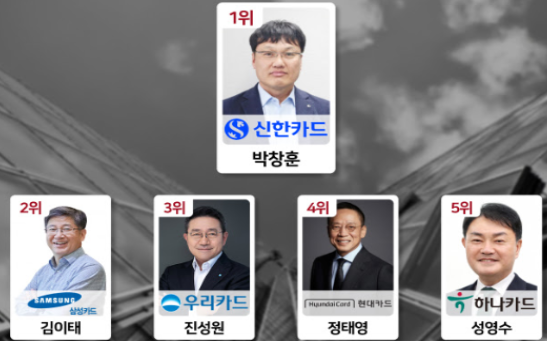 박창훈 대표가 카드사 금융인 부문 1위를 차지했으며 △김이태 삼성카드 대표 △진성원 우리카드 대표 △정태영 현대카드 대표 △성영수 하나카드 대표 등이 뒤를 이었다.