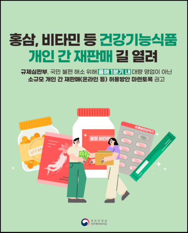 국무조정실 규제심판부는 회의를 열고 건강기능식품에 대해 소규모 개인 간 재판매를 허용하도록 식품의약품안전처에 권고했다고 16일 밝혔다.