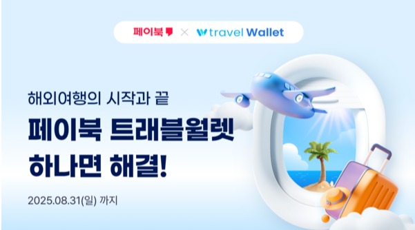이벤트는 오는 8월 31일까지 페이북 트래블월렛 이용가능 카드를 보유하고 있거나 신규 발급받은 고객 등을 대상으로 진행된다.