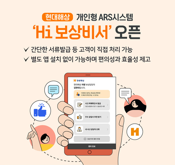 현대해상이 자동차 사고 보상에 필요한 간단한 서류 발급 등을 고객이 셀프 처리할 수 있는 개인형 ARS 시스템 'Hi보상비서'를 업계 최초로 오픈했다고 24일 밝혔다.