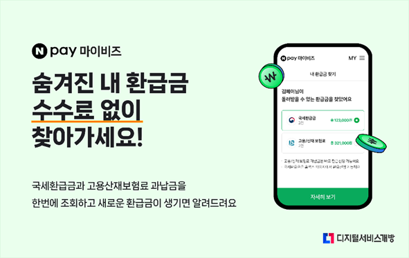 환급금 찾기 서비스는 행정안전부가 주도하는 디지털서비스 개방 사업 참여에 따라 국세청과 근로복지공단, Npay가 직접 연동돼 국세 환급금, 고용·산재보험료 과납금 환급금을 한 번에 조회하고 입력한 계좌로 바로 환급받을 수 있다.